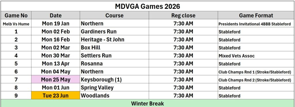 The Challenge has been run every year since 2010 (except COVID in 2021) with Melbourne Vets runaway champions for 11 of those years. Naturally we want to keep up our “unblemished” record and so I am looking for 50 players, with the last 10 bookings to form a reserve for the inevitable withdrawals as we get closer to the event. 40 members will be divided into 20 teams and play 4BBB against 20 teams from the Hume Vets.