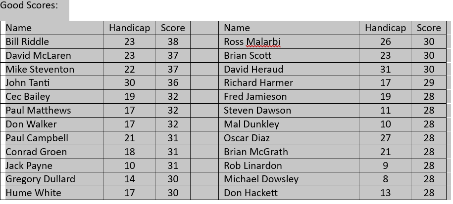 The B Grade Winner was Bill Riddle (23) from Howlong with 38 points from runner up David McLaren (23) from Spring Valley on 37 points on a countback from Mike Steventon (22) from Northcote.