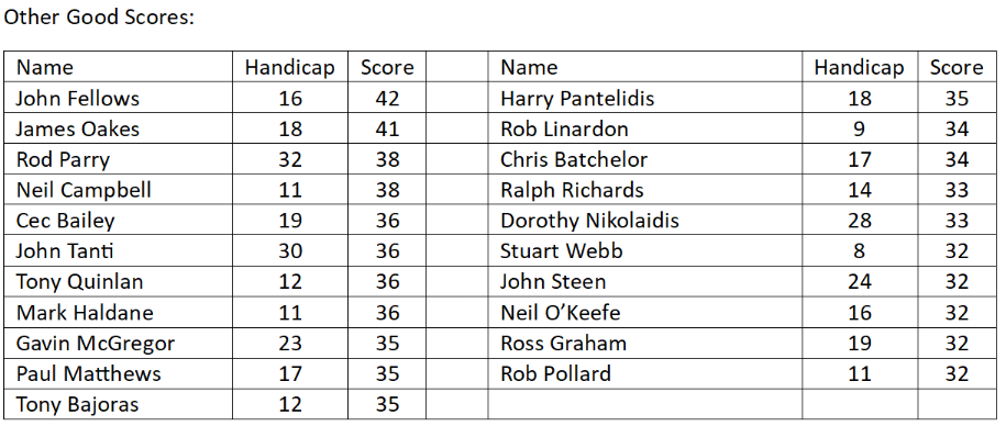 The B Grade Winner was Phil Moorby (36) from Northcote with 34 points from runner up Steve Holmes (19) from Camberwell on 32 points.